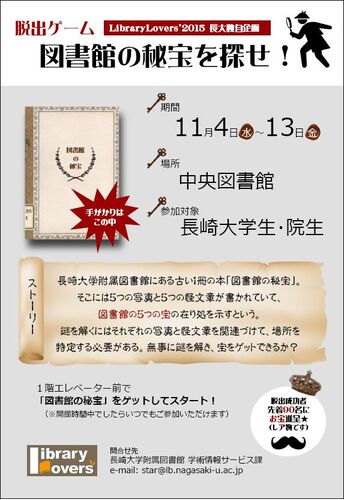 本日11月4日(水)より、Library Lovers' キャンペーン 長大独自企画 <脱出ゲーム:図書館の秘宝を探せ!> が 始まりました! 5つの写真と5つの怪文書を手がかりに、 図書館に眠る秘宝を探し出すゲームです。 *******************************************…