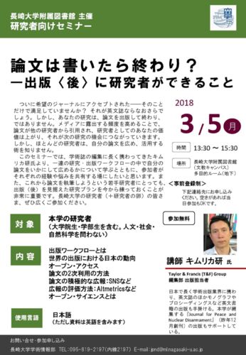 研究者向けセミナー「論文は書いたら終わり?―出版〈後〉に研究者ができること」を開催いたします。論文が出版された後でそれをいかにして広め、次の研究につなげていくかを学びましょう。 長崎大学に所属の方であればどなたでも参加可能です。 研究室にご所…