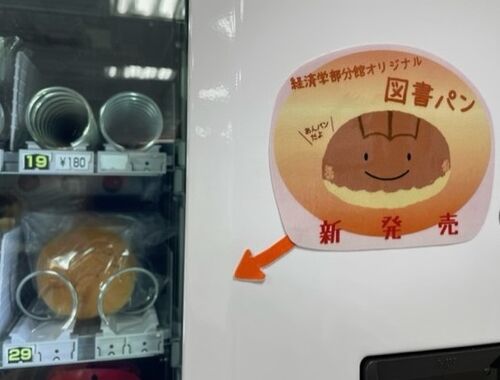 経済学部分館 情報サロンにある軽食と飲み物の自販機に新メニューが入りました!その名も「図書パン」! さっそく買ってみましょう。でてきたのは、ふんわり、まあるい素朴なパンです。 こちら、実は経済学部分館オリジナル。焼き印の「図書」は本学学生(教…