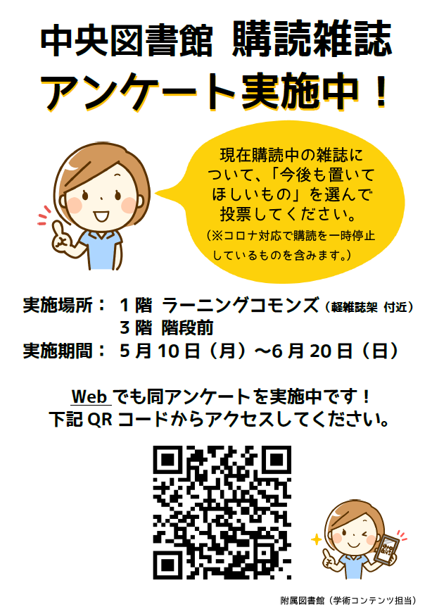 中央図書館では、本日より購読雑誌についてのアンケートを始めました。