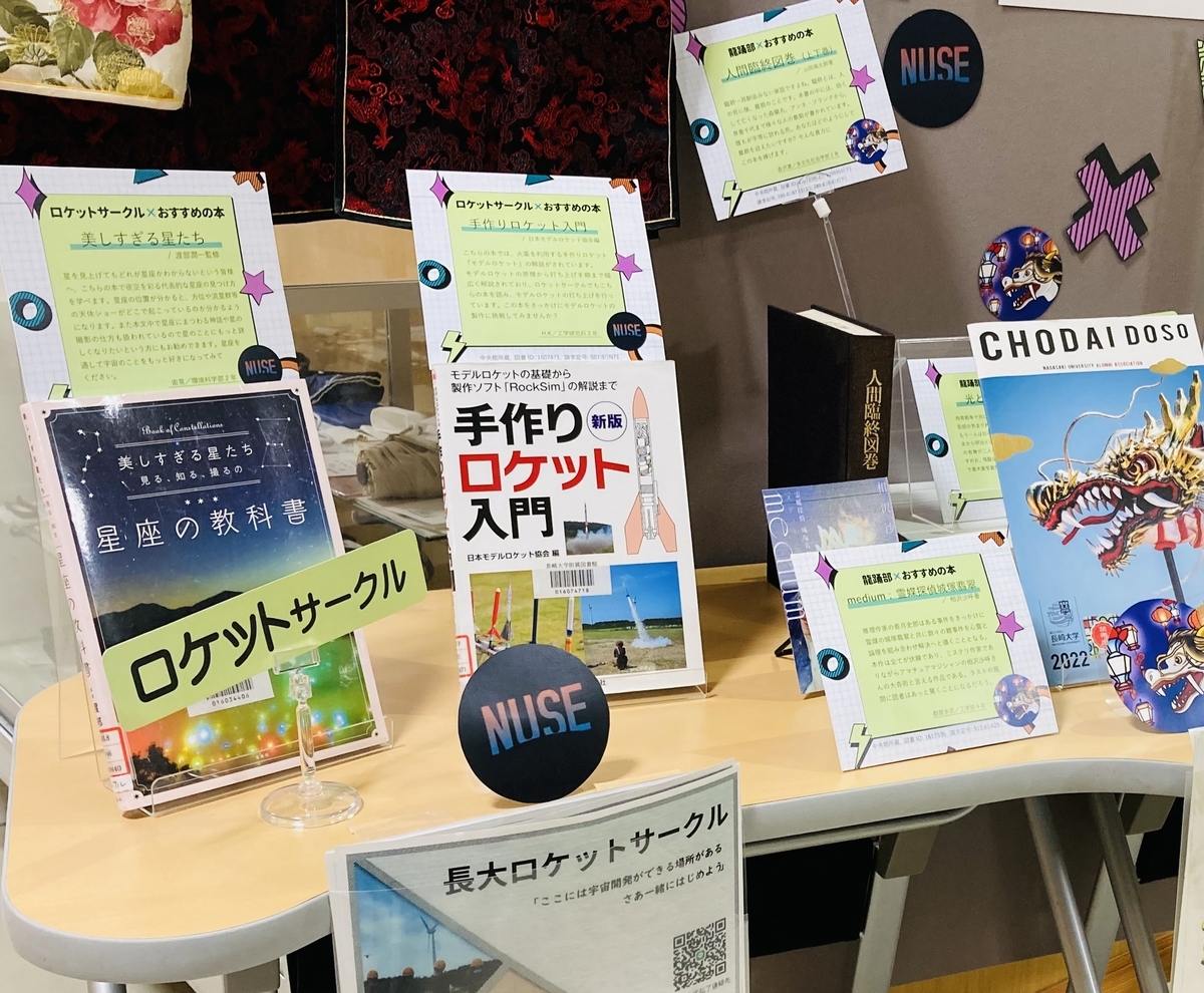 中央館では「長大サークルおすすめの本」の展示を始めました。