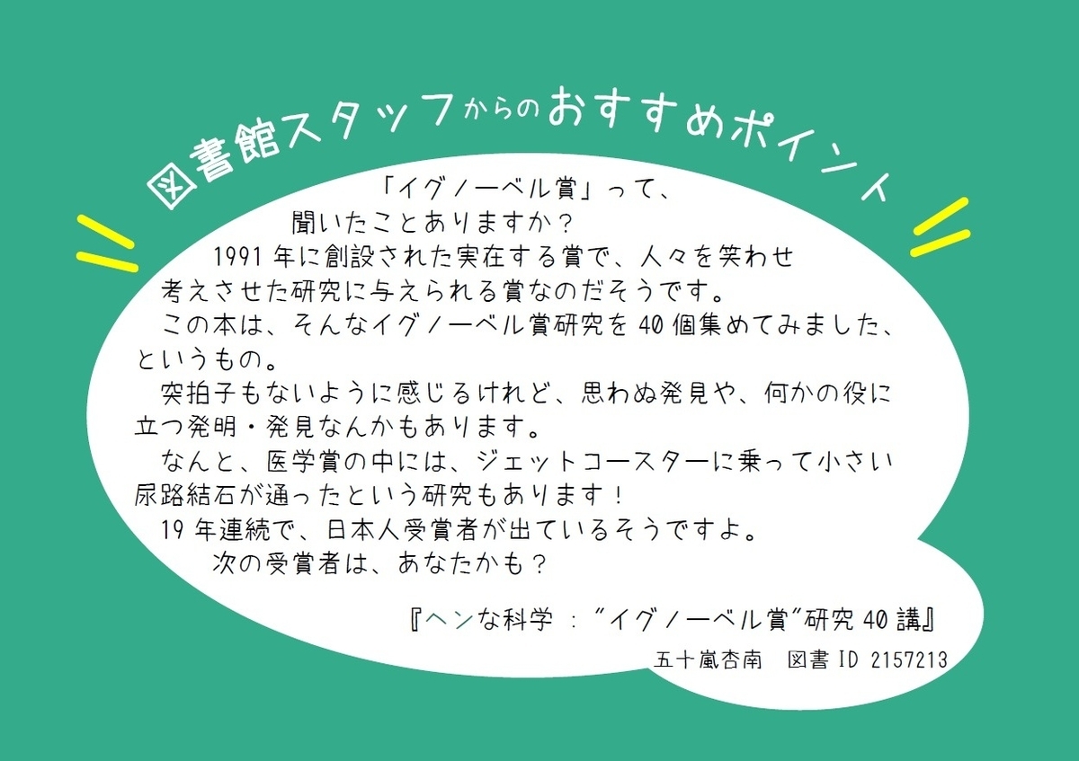 書名:ヘンな科学 : "イグノーベル賞"研究40講 / 五十嵐杏南著