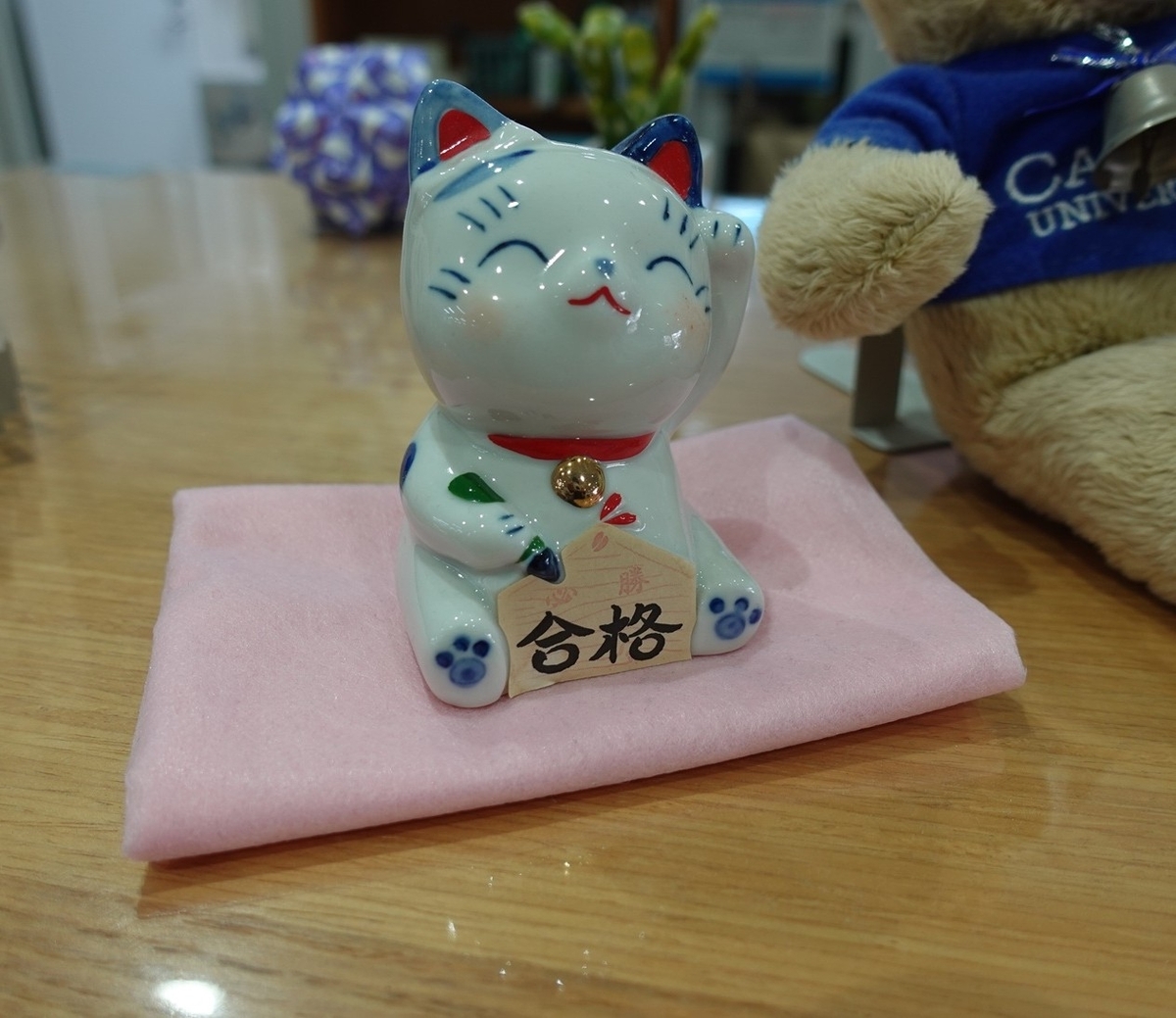 (カウンターにこっそりお目見えしている合格祈願ネコ)